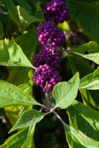 - Beautyberry – Callicarpa sp. – C. americana is a native, deciduous shrub in the southeastern US and there are also lovely cultivars from Asia worth considering. They all provide a late show of incredibly gloriously iridescent magenta purple berries along the stems. The fruit persists until the foliage drops in the fall and the birds will add to the colorful display with their visits to forage through the colored leaves and bright berries.