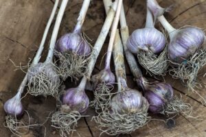 - Garlic – Allium sativum – On the vegetable garden front consider planting garlic in the fall with the goal of a June or July harvest next year. Garlic comes in many colors and can have soft necked stems that are suitable for braiding together or hard neck varieties that produce delectable edible “scapes” as they bloom. Harvest the flower scapes to eat and allow the garlic to keep building its bulb for later harvest. Many of the more colorful varieties are not easy to find in grocery stores so try growing them for yourself. Take a bulb of garlic and break the cloves apart to plant individually. Each clove will develop into a full bulb next summer for harvest.
